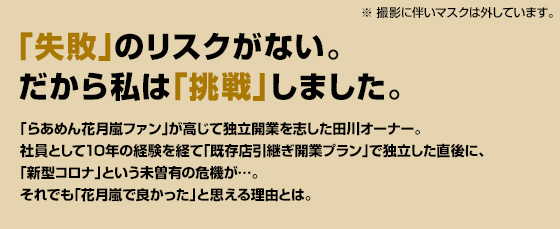 らあめん花月嵐のファンだったからです。美味しさに惚れ込んでいたので平日は同僚と、休日は家族と利用していました。ある時「FCオーナー募集」のリーフレットをお店で見かけ「やってみたい!」と思ったんです。飲食業は未経験で不安もあったのですが、好きな気持ちがあればきっと大丈夫だろうと。家族も快く賛成してくれたので、もうやり切るしかない!と思いました。他のFCとの比較検討はしていないですね。独立することが目的ではなく「花月嵐の美味しいラーメンでお客さんを笑顔にする」が目的だったので。挑戦へのモチベーションは“好き”という気持ちです。